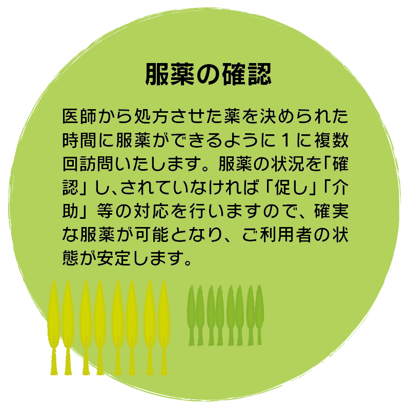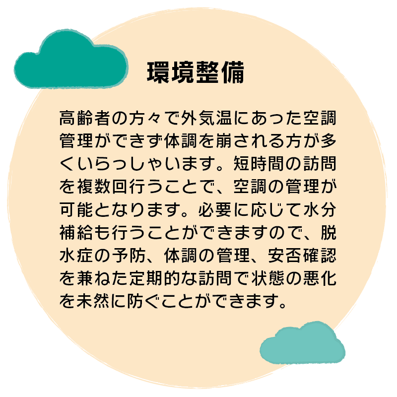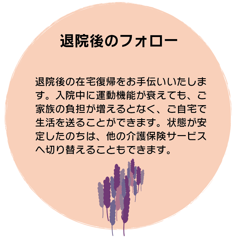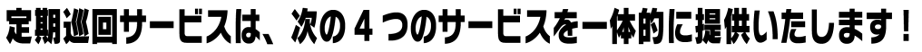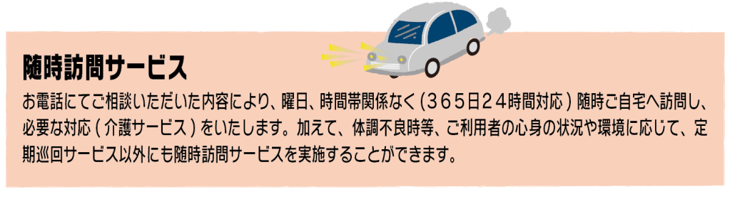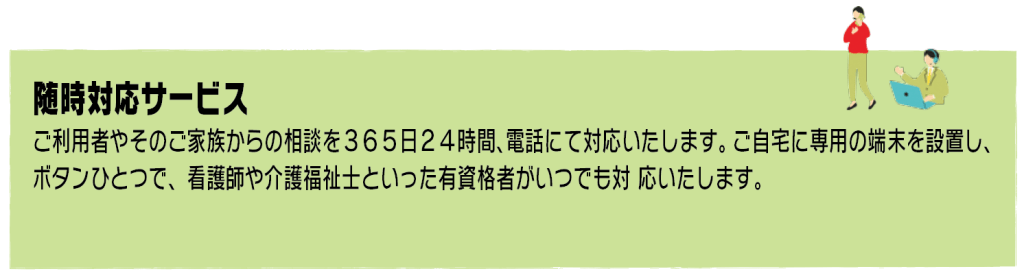 介護が必要な方でも、住み慣れた自宅(地域)で日常生活が送れるよう、365日24時間 対応で在宅生活を支える介護保険サービスです。介護と看護が連携し、毎日の定期的な訪問 に加え、その時の状況に応じて随時対応、随時訪問を行うことができます。
